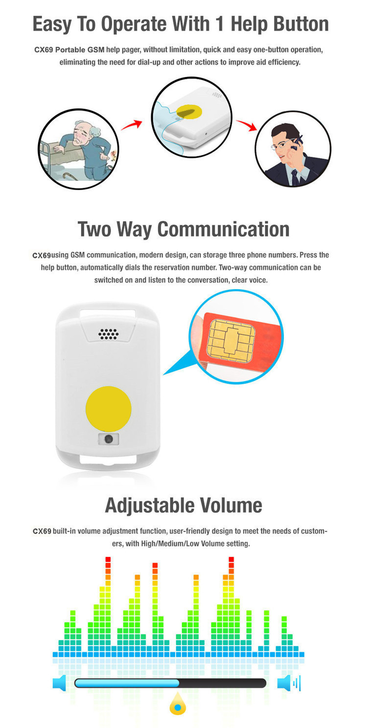 CX-69 GSM Help Alarm can help people to solve the worries about elders/children live alone safety problems, it will assist people prevent the dangerous of falling down/being lost/medicine care delay.