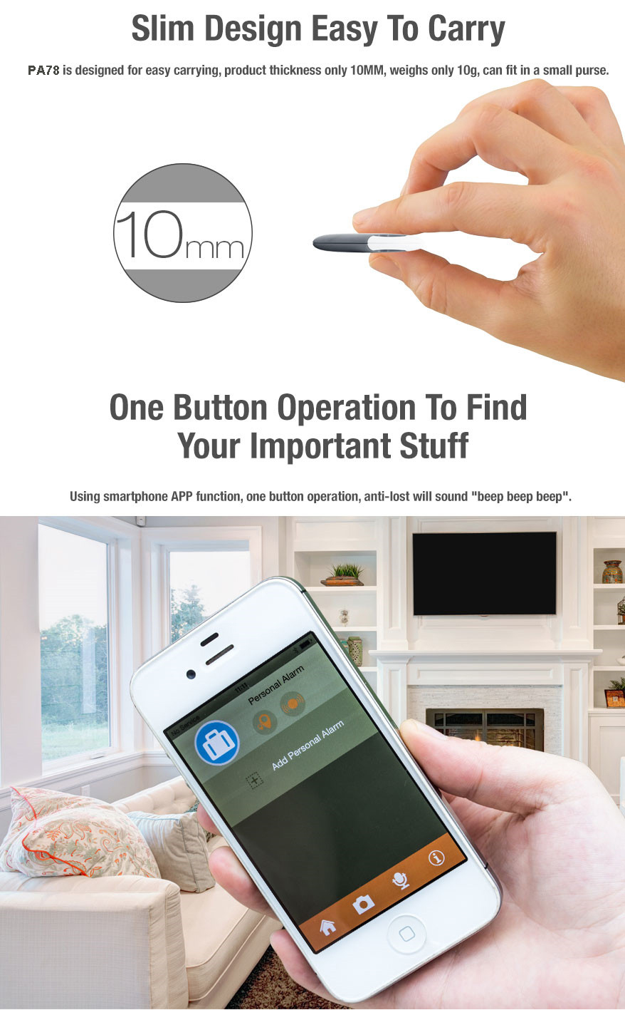 PA78 is a Bluetooth anti-lost alarm key finder alarm device, mini size, simply operation for attention and find your keys,wallets,mobile and any other vlue things